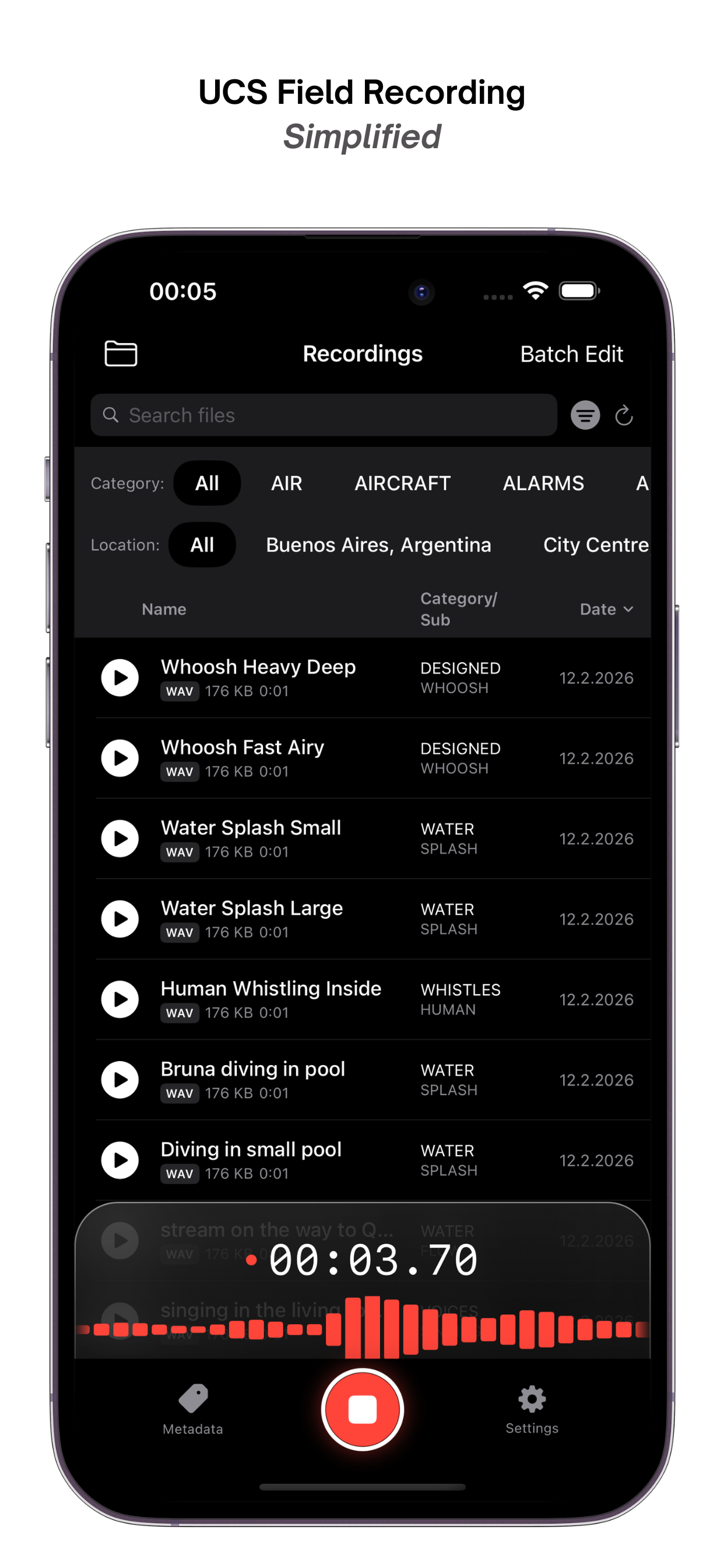 Sonidata fully integrates the Universal Category System (UCS v8.2) for standardizing sound effects metadata. When you tag a recording, you can assign it a Category, Subcategory, CatID, FX Name, Creator ID, Source ID, and Location. Sonidata then automatically renames the file to a UCS-compliant format (e.g., ANMLDog_Bark-Close_Creator_Mic_Location.wav) and can seamlessly organize your files into a matching folder hierarchy.